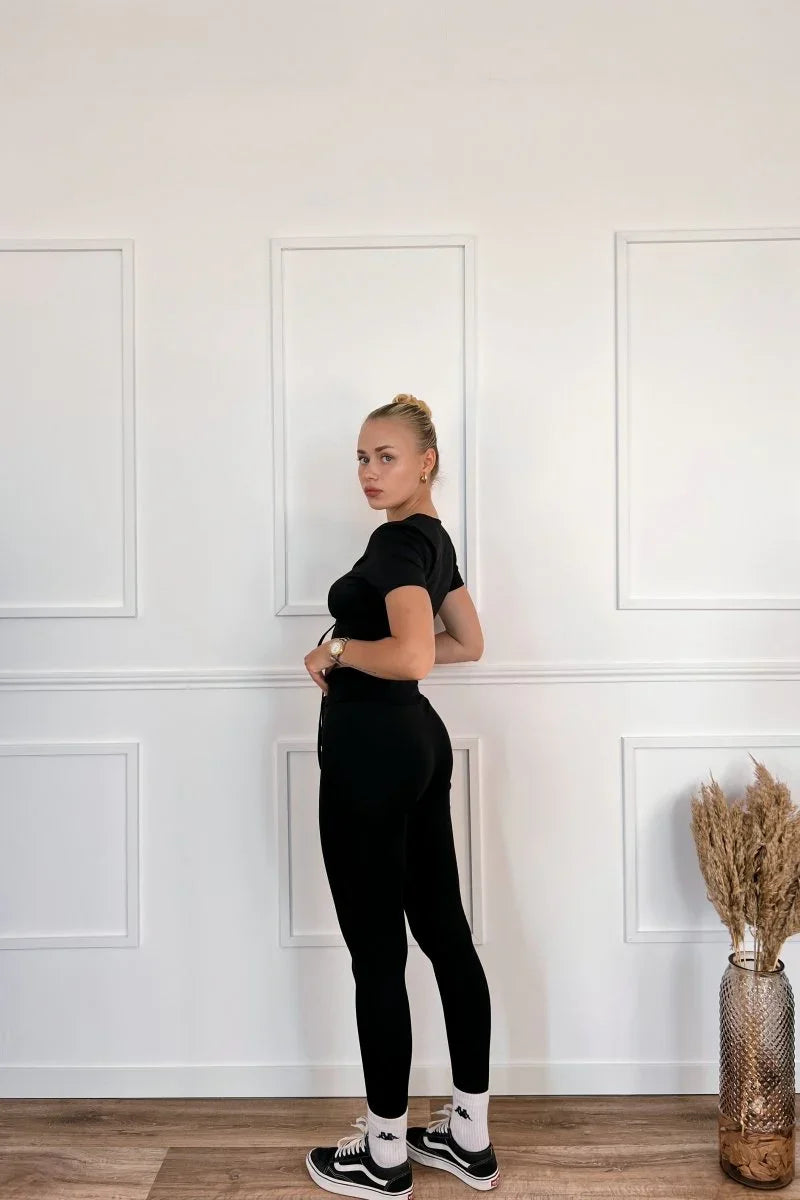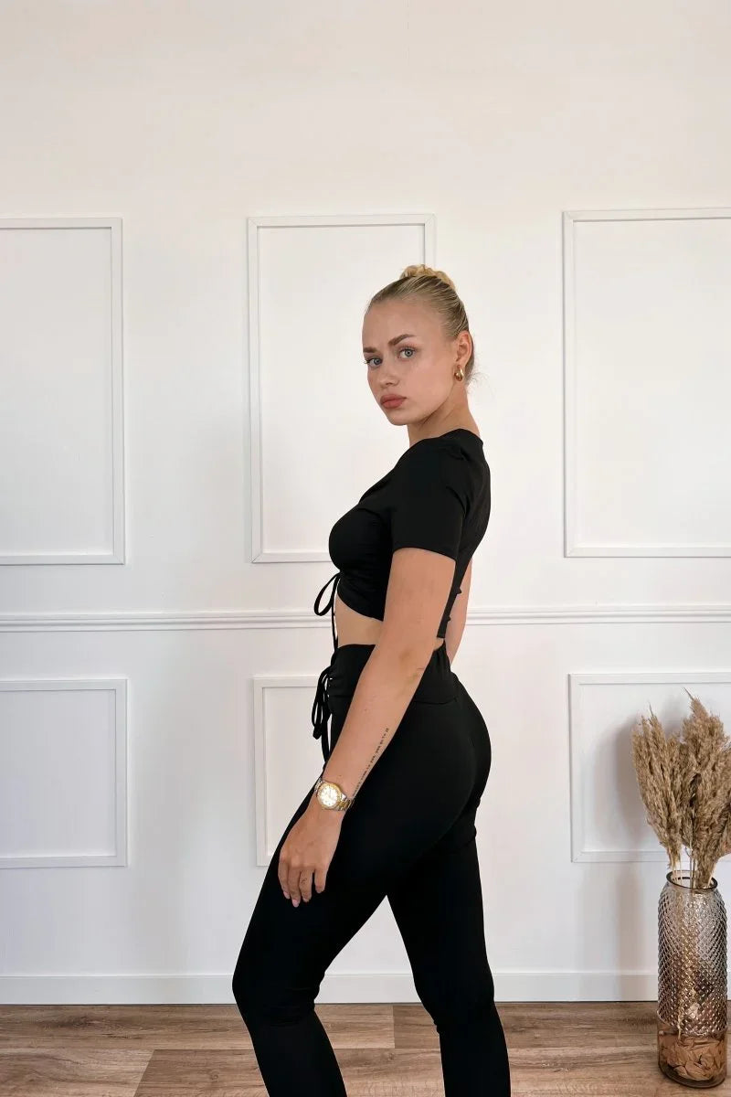 Descubre el Conjunto Licra: un conjunto de camiseta y leggings con lazo para ajustar, diseñado para quienes buscan comodidad y libertad de movimiento en entrenamientos, yoga o uso diario activo.