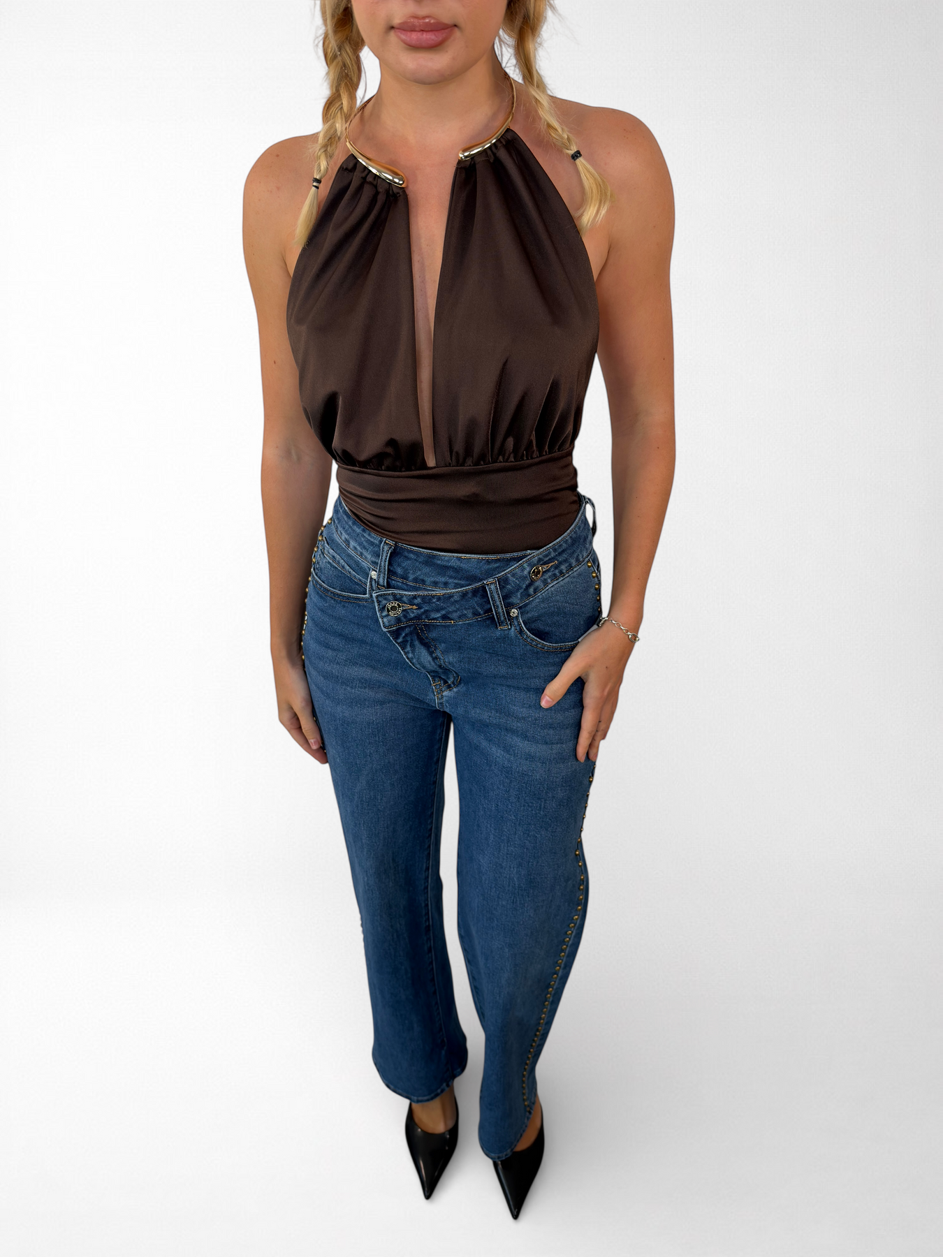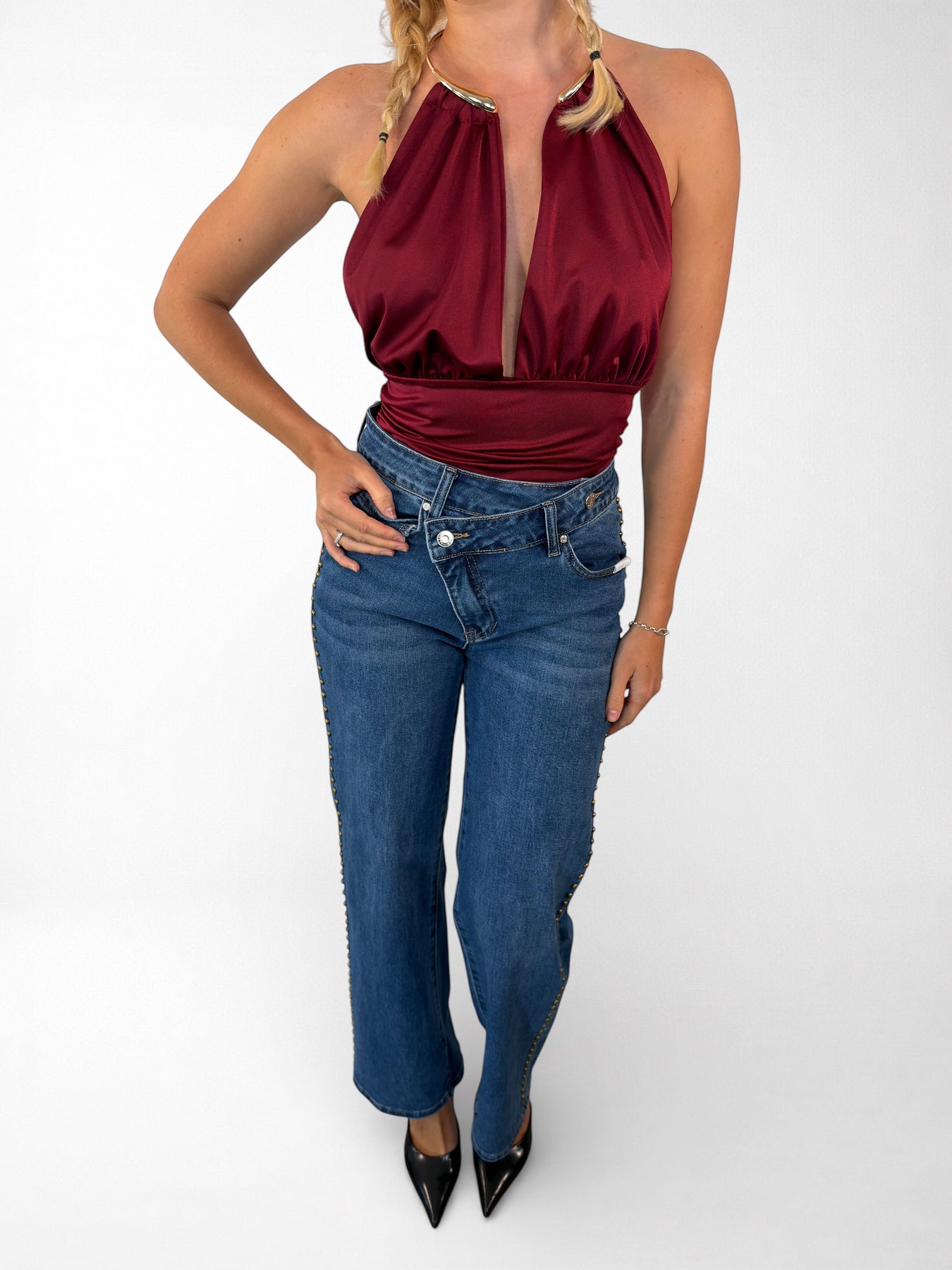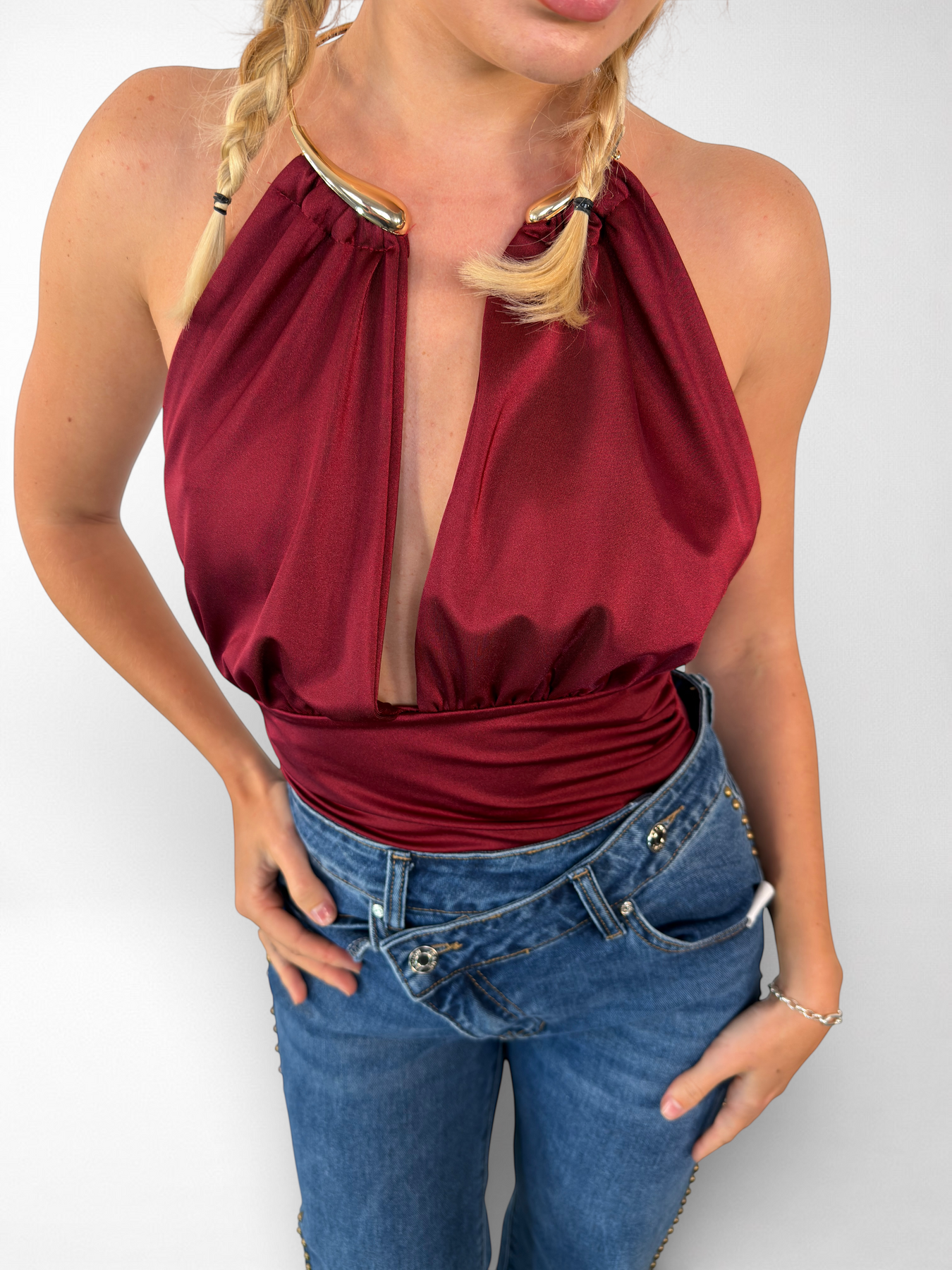 Body de licra con un toque audaz y sofisticado. Confeccionado en Italia con una composición de 88% poliéster y 12% elastano que garantiza máxima elasticidad y comodidad en cada movimiento. El cuello destaca con un elegante aro metálico en color oro que añade un detalle de lujo y distinción. Perfecto para quienes buscan prendas versátiles que combinen funcionalidad con estilo atrevido.