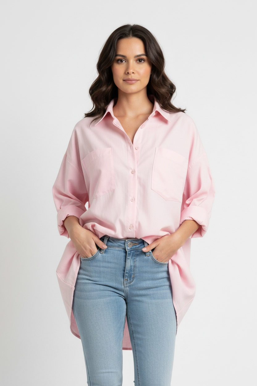 La camisa oversize en color rosa es perfecta para quienes buscan comodidad y estilo. Con su diseño holgado y prácticos bolsillos, te ofrece un look moderno y funcional. Ideal para cualquier ocasión, esta camisa combina bien con diferentes outfits y te hará sentir relajada y a la moda.