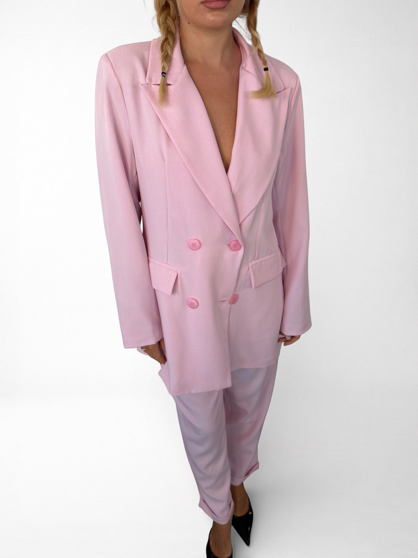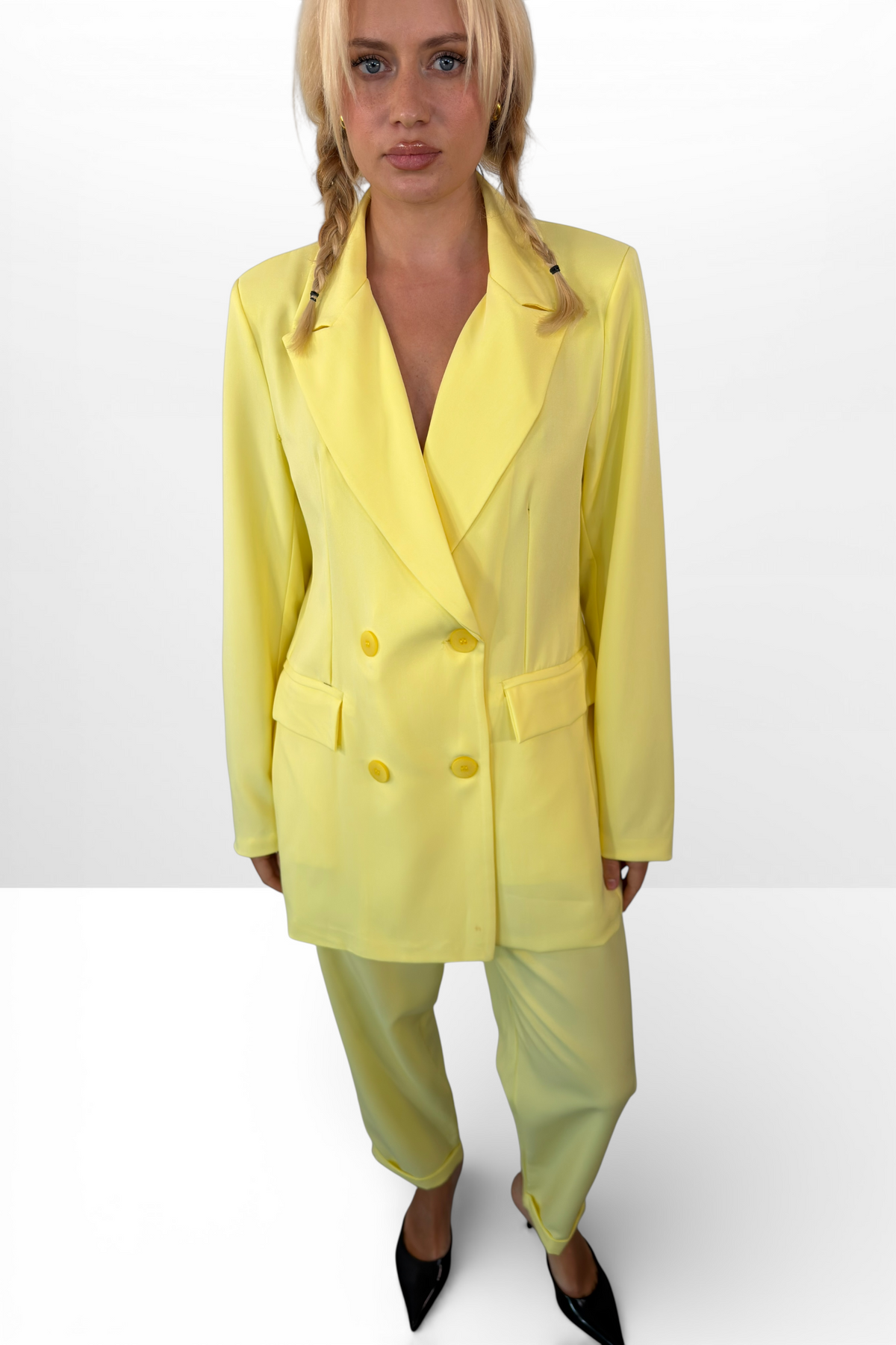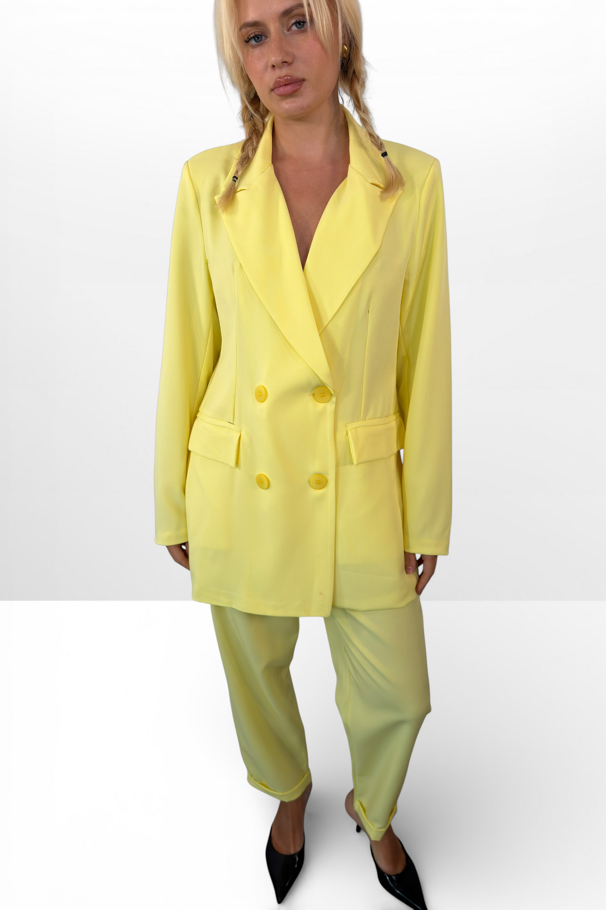 Conjunto Debora: audacia italiana en cada detalle. Tejido premium fabricado en Italia con 95% poliéster y 5% elástico para máxima comodidad y movimiento. La blusa destaca con siete botones y falsos bolsillos que añaden carácter, mientras que el pantalón de cintura elástica con cierre de botón y cremallera garantiza un ajuste perfecto. Un conjunto versátil que combina elegancia sofisticada con practicidad, ideal para quien se atreve a marcar tendencia sin renunciar al confort.
