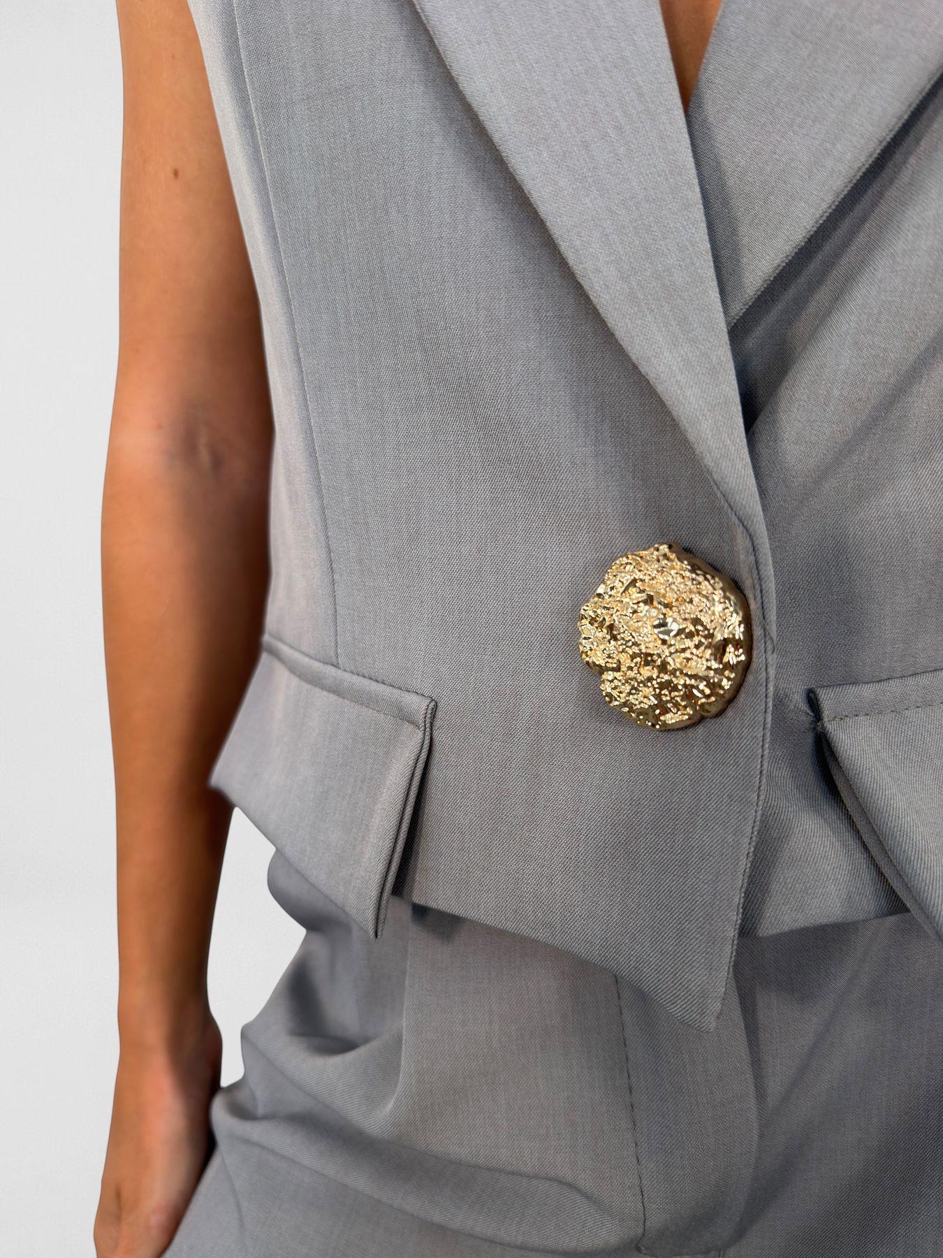 Descubre este elegante conjunto fabricado en Italia, que combina confort y estilo. Con un chaleco que presenta hombreras y un sutil detalle en botones dorados, y pantalones con cintura elástica y prácticos bolsillos, disfrutarás de una apariencia sofisticada sin sacrificar la comodidad. Ideal para cualquier ocasión.