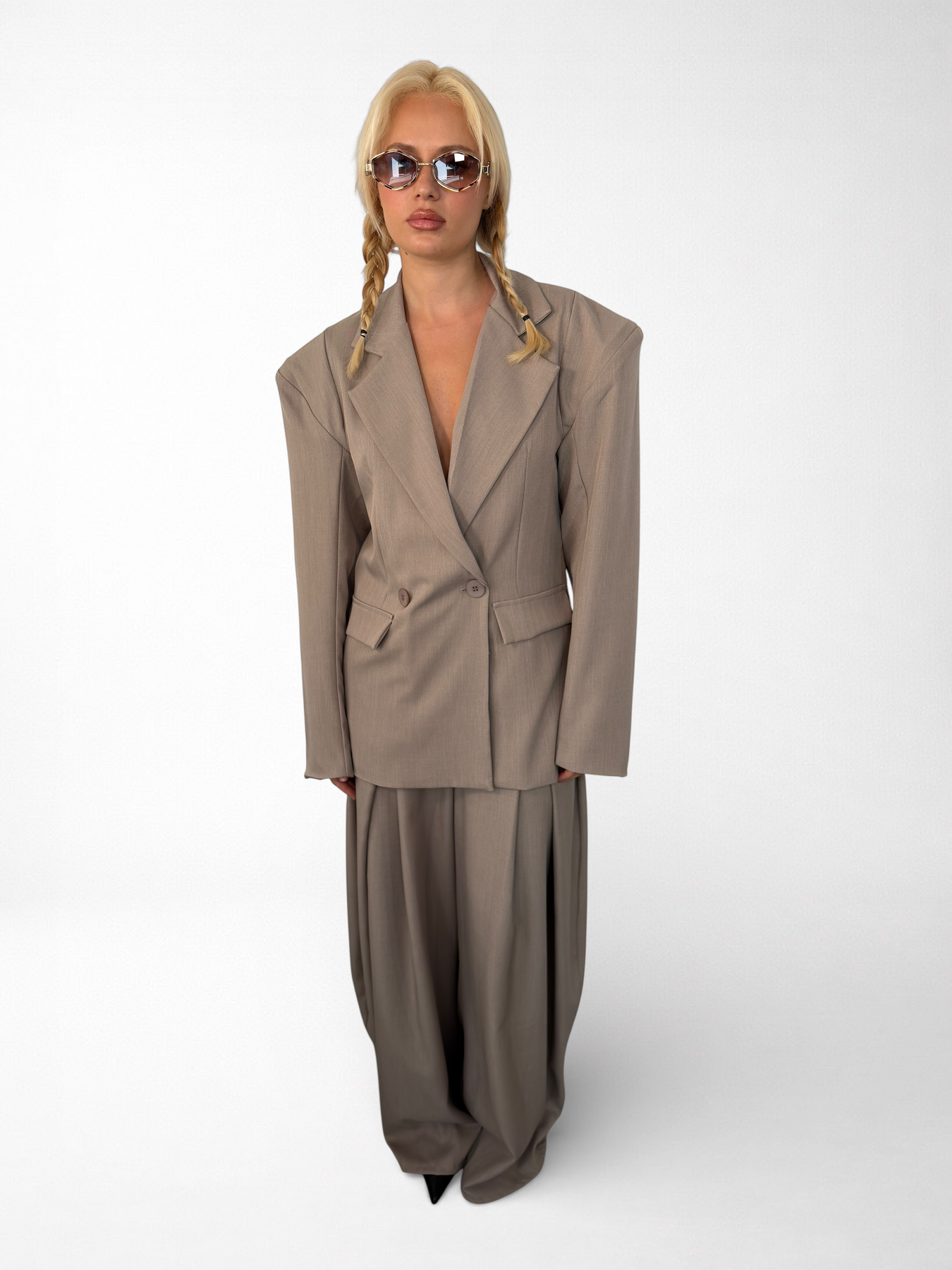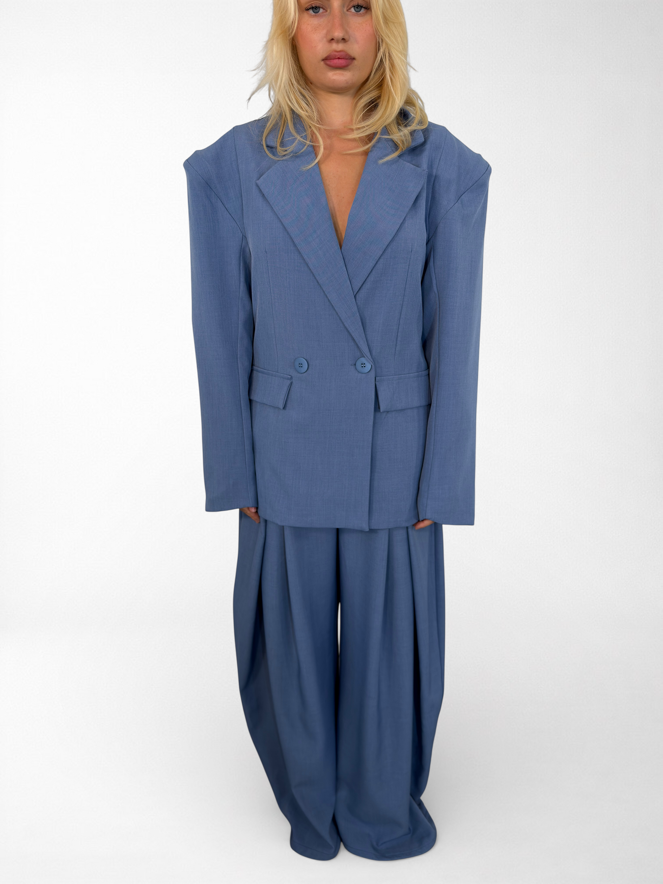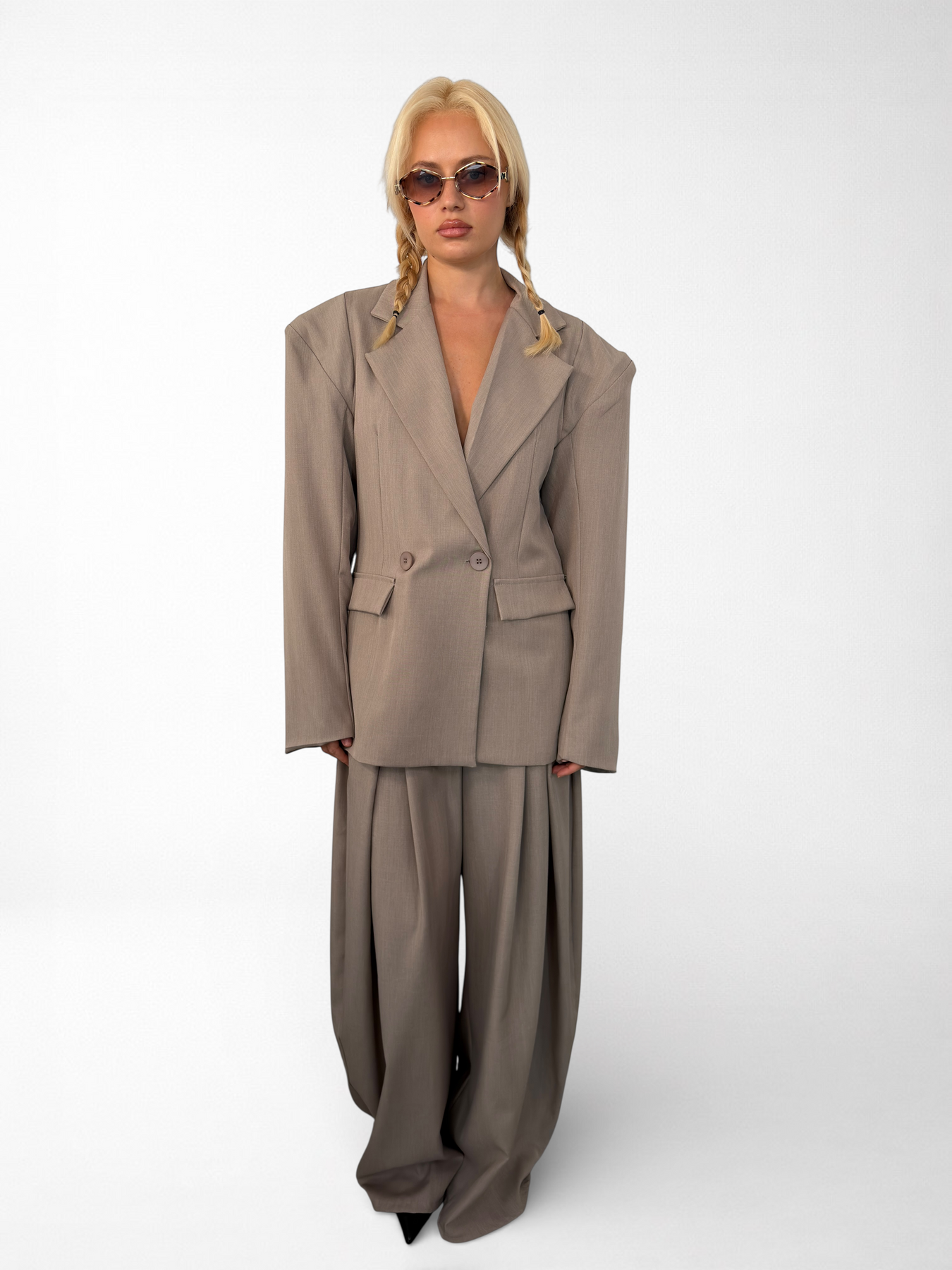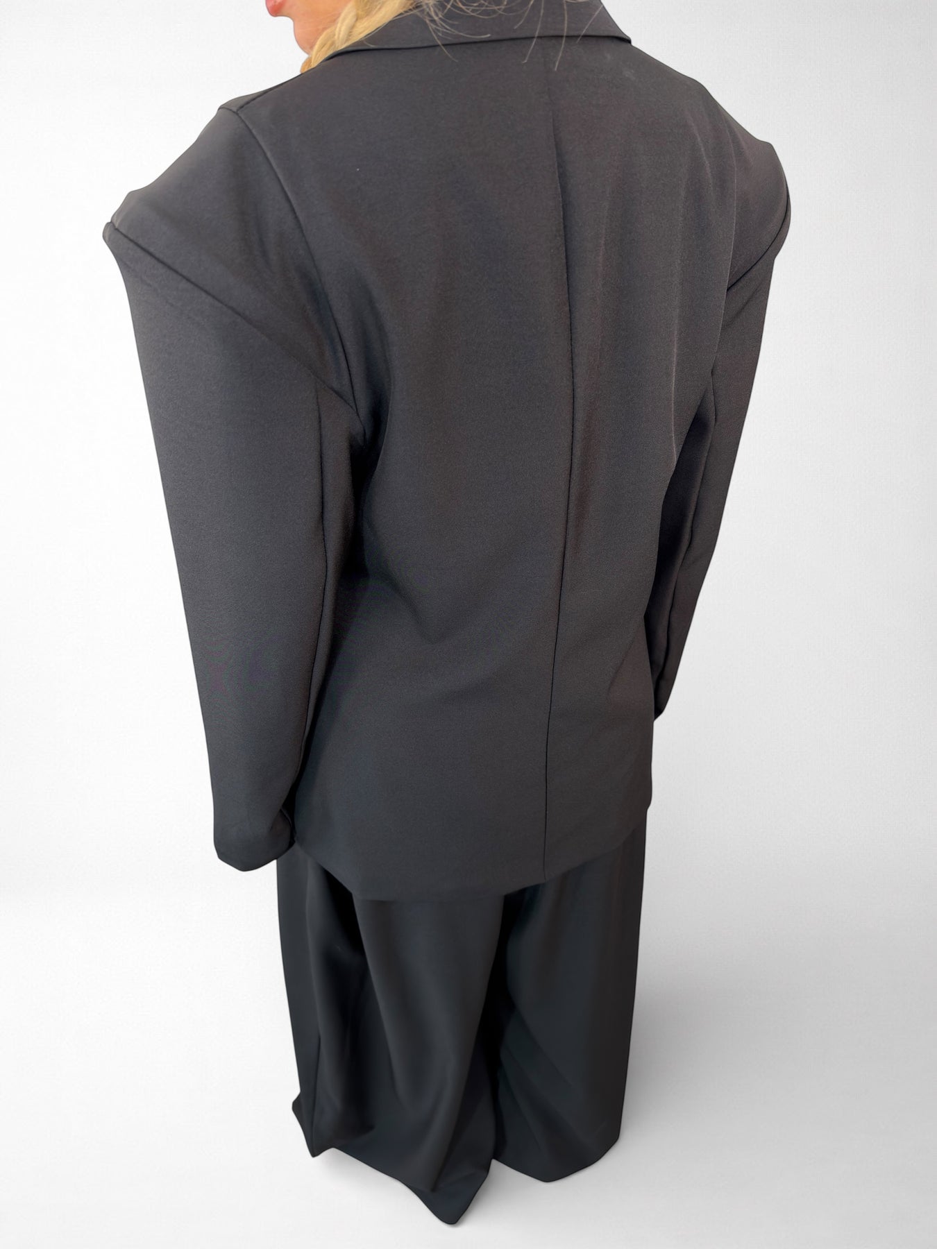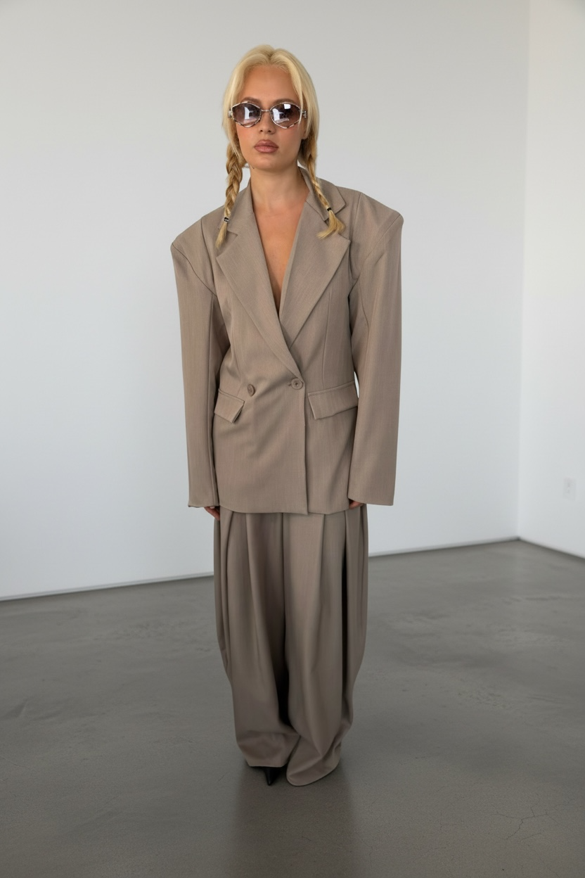 Conjunto Simona: pura actitud italiana. Fabricado en Italia con 95% poliéster y 5% elastan, esta propuesta oversized combina blazer estructurada con hombreras pronunciadas, forro Eva y bolsillos falsos con cierre de botones, junto a pantalón de cintura elástica con botón y cremallera. Comodidad sin sacrificar el impacto visual. Viste sin límites.