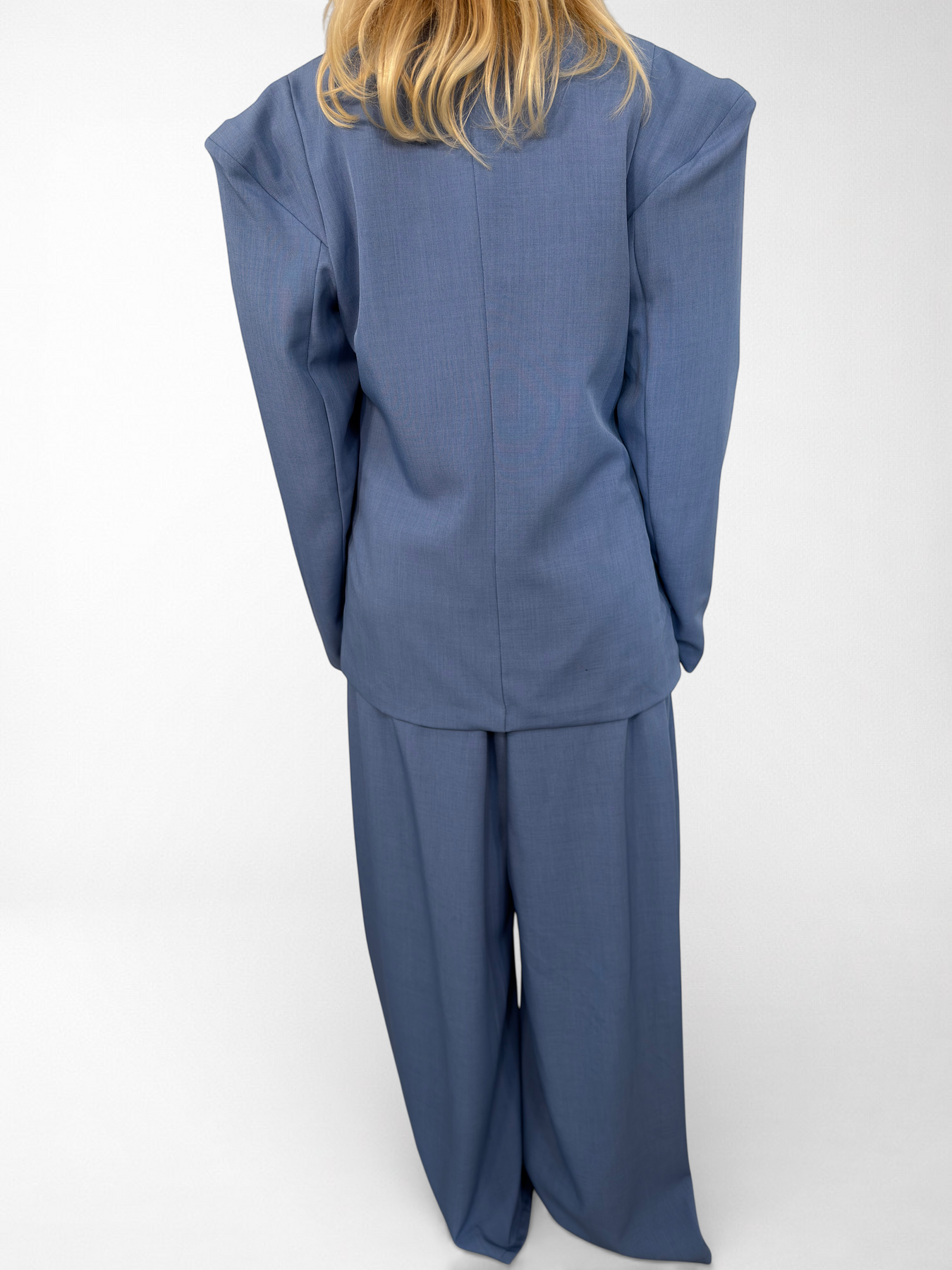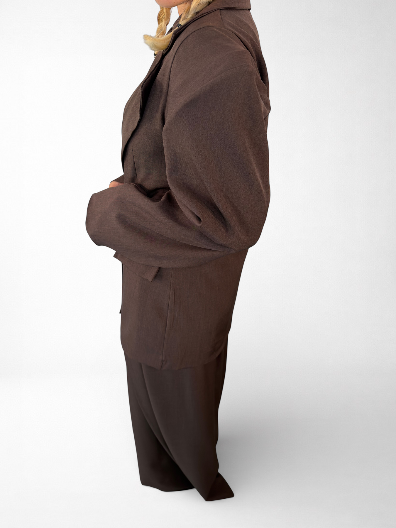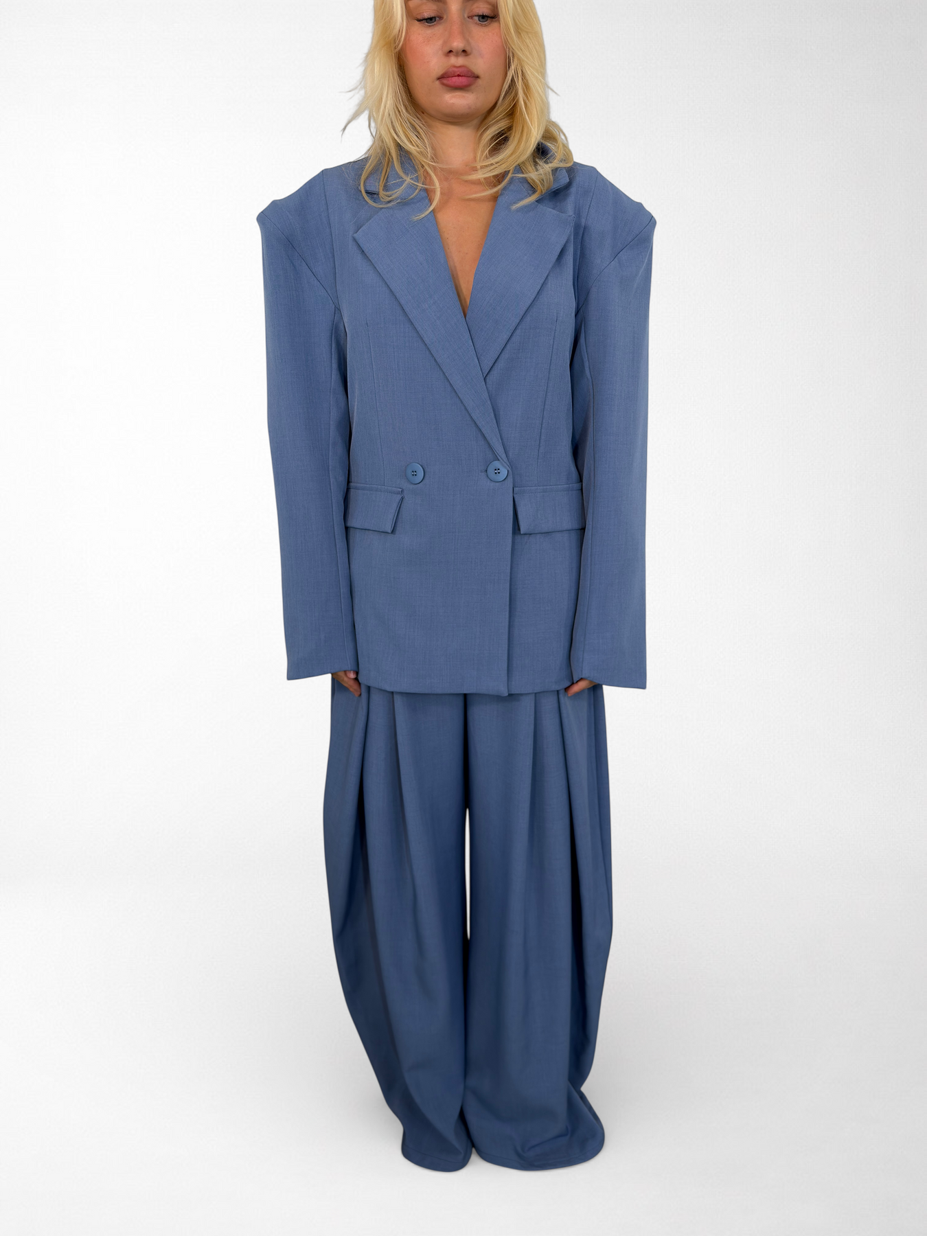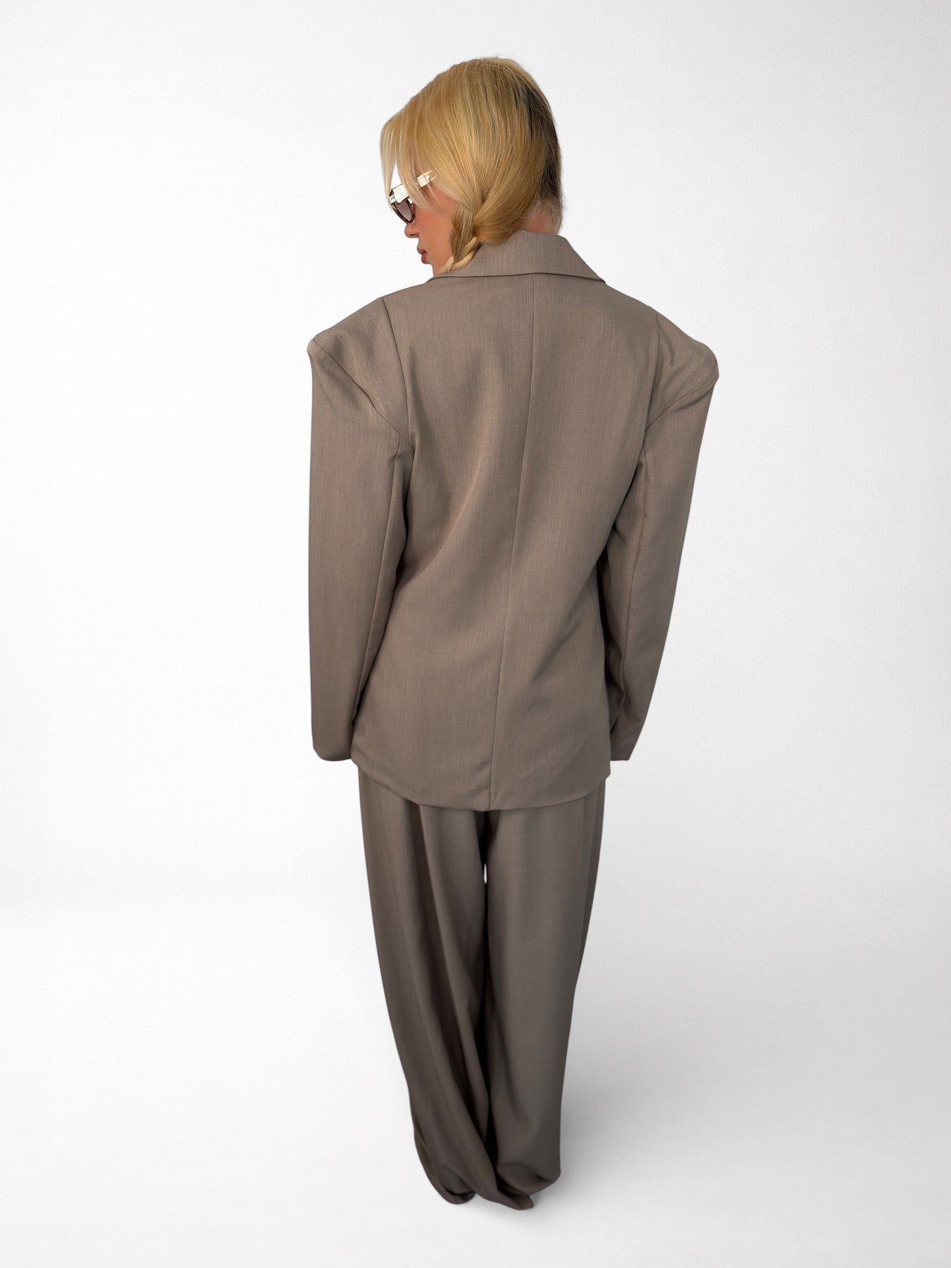 Conjunto Simona: pura actitud italiana. Fabricado en Italia con 95% poliéster y 5% elastan, esta propuesta oversized combina blazer estructurada con hombreras pronunciadas, forro Eva y bolsillos falsos con cierre de botones, junto a pantalón de cintura elástica con botón y cremallera. Comodidad sin sacrificar el impacto visual. Viste sin límites.