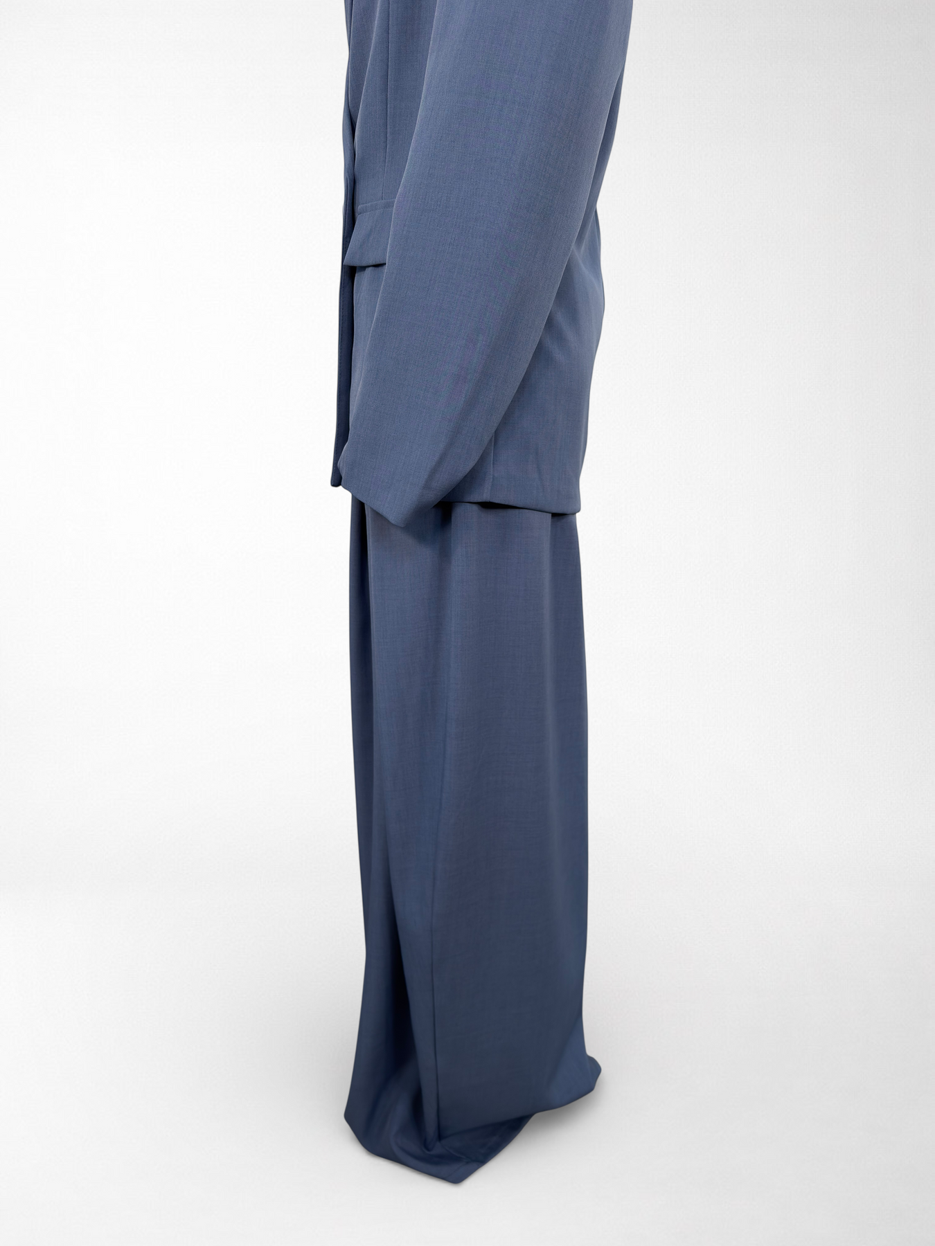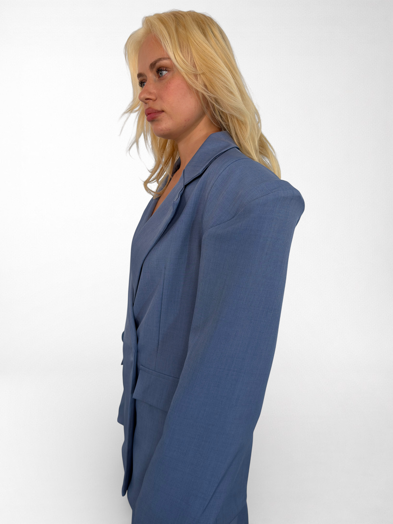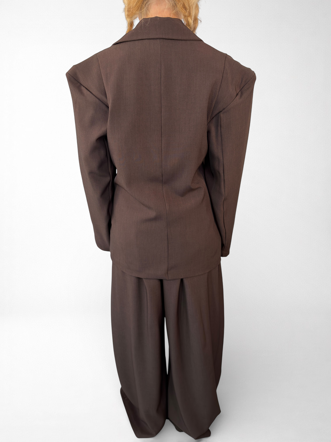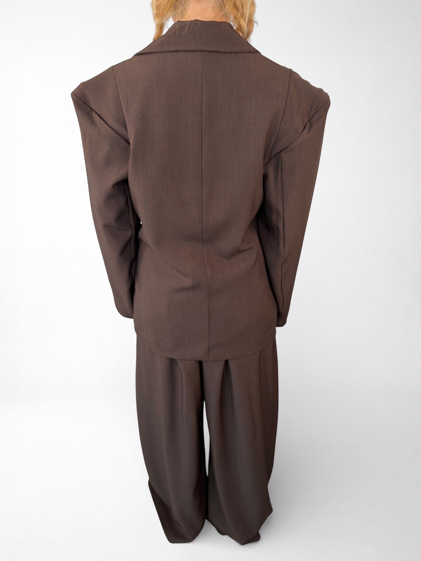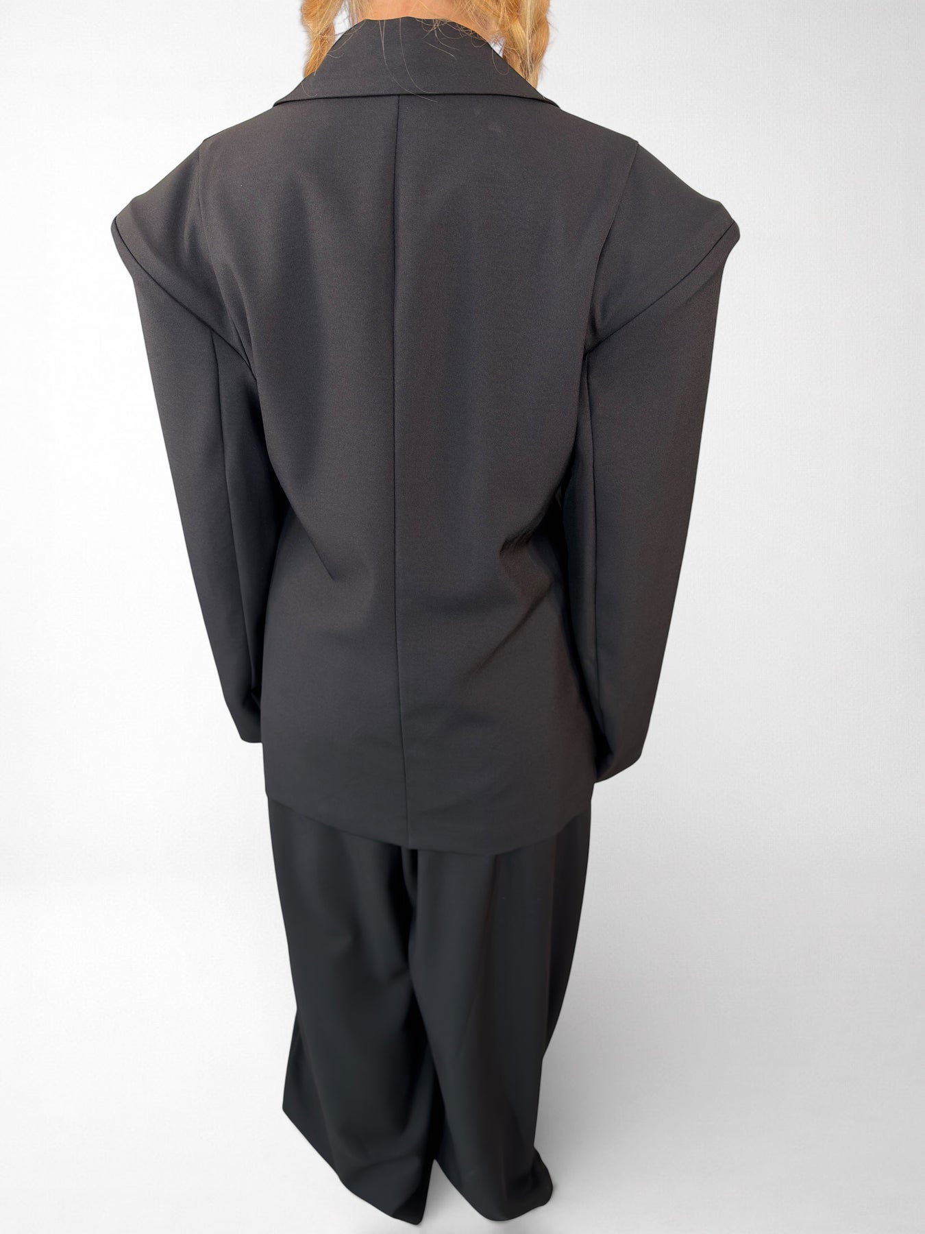 Conjunto Simona: pura actitud italiana. Fabricado en Italia con 95% poliéster y 5% elastan, esta propuesta oversized combina blazer estructurada con hombreras pronunciadas, forro Eva y bolsillos falsos con cierre de botones, junto a pantalón de cintura elástica con botón y cremallera. Comodidad sin sacrificar el impacto visual. Viste sin límites.