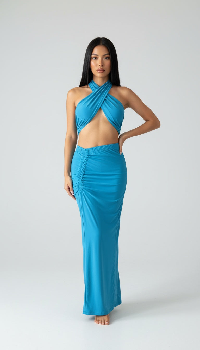 El Conjunto Sonia consiste en una falda y un top fabricados en licra elástica de color celeste. Esta combinación garantiza comodidad y fácil movimiento, gracias a la flexibilidad de la licra. Ideal para actividades cotidianas, su diseño permite un ajuste que se adapta al cuerpo, brindando un look estilizado.