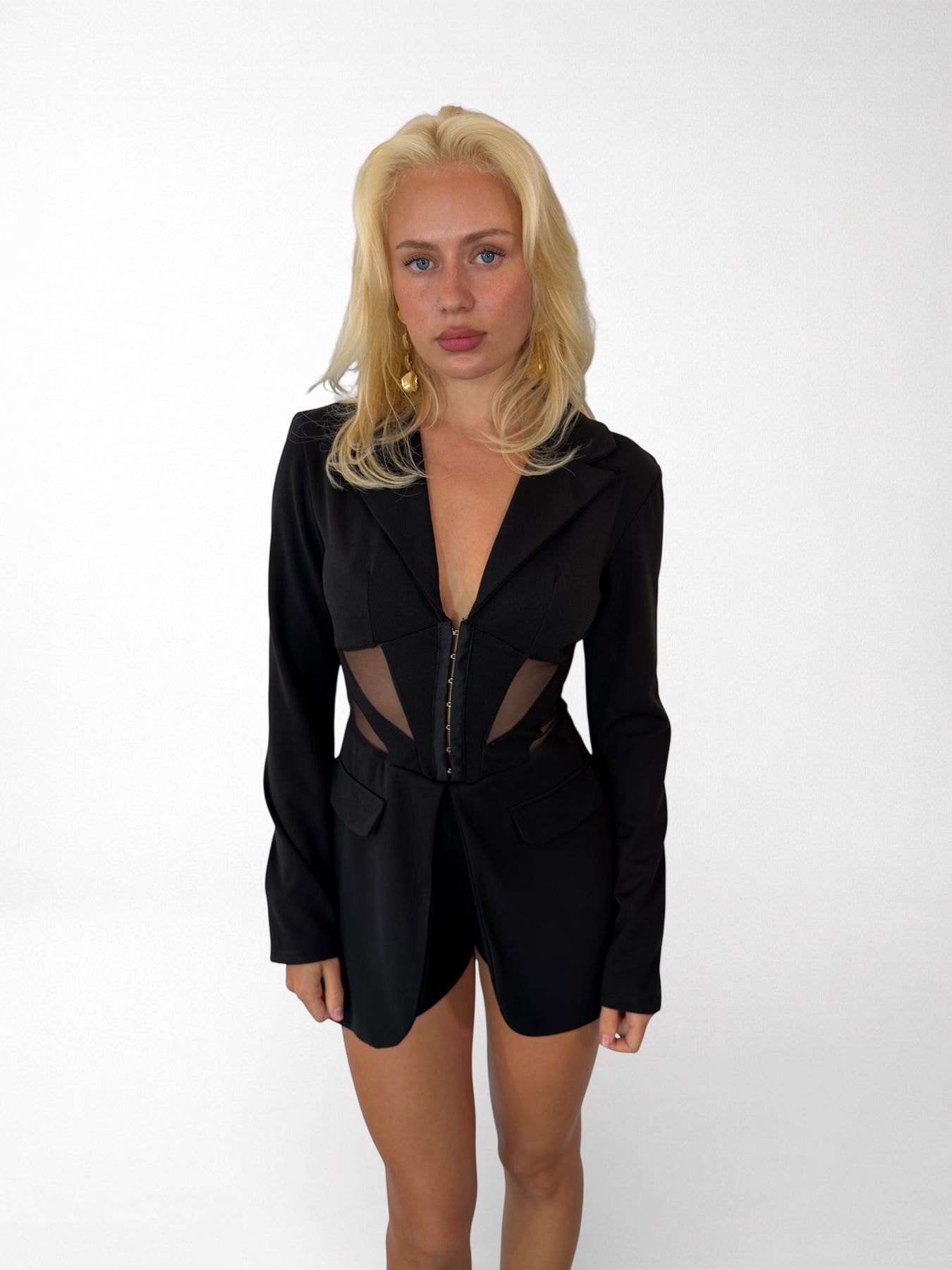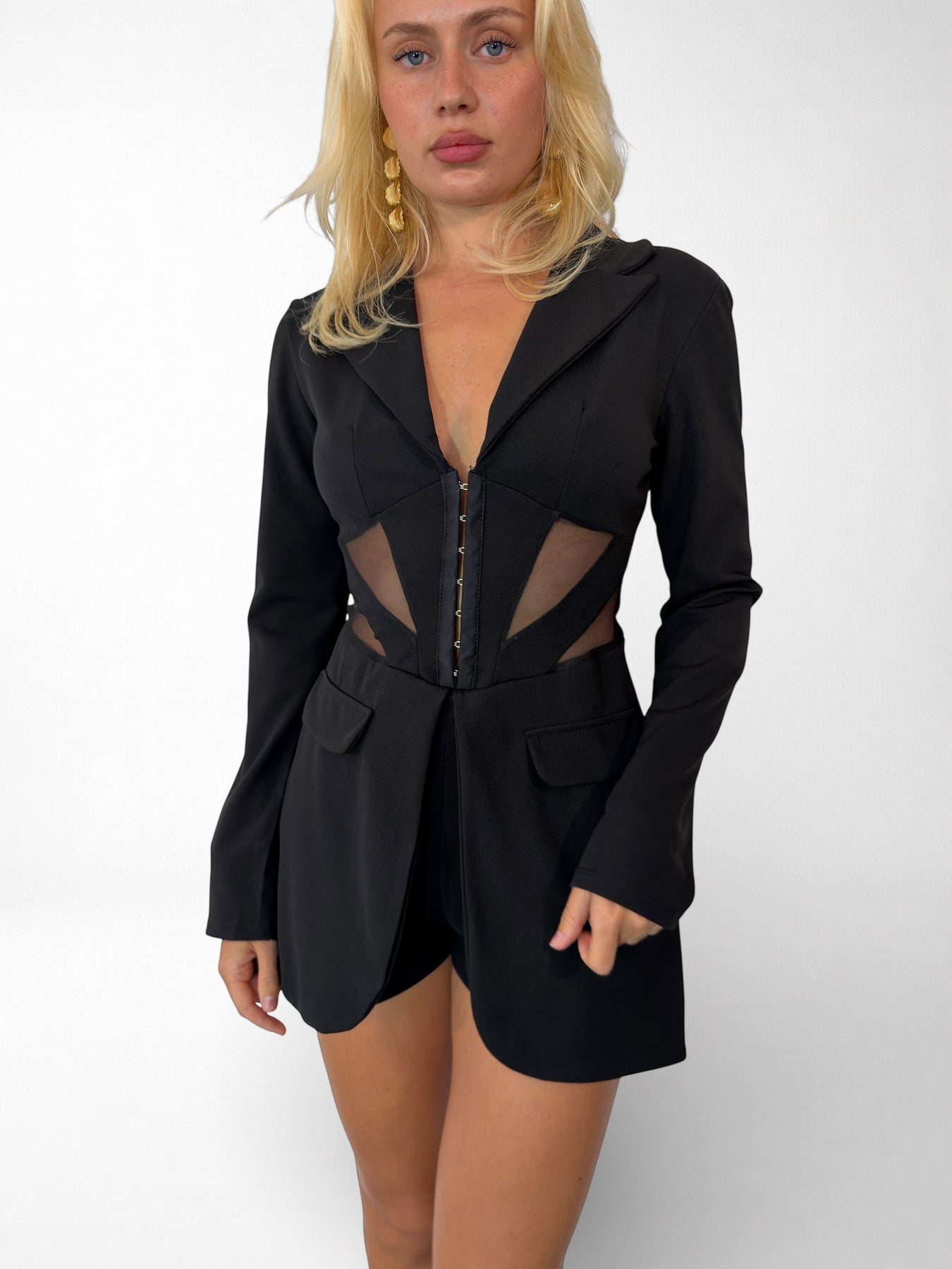 Mono Carlota: la prenda que desafía la convención. Confeccionado en Italia con un tejido elástico de poliéster y elastano, lleva hombreras, este mono abraza tu cuerpo con libertad y movimiento. Cierre de ganchos que combina funcionalidad con un toque audaz, mientras que los falsos bolsillos mantienen las líneas limpias y sofisticadas. Diseñado para quien se atreve a destacar sin compromisos.