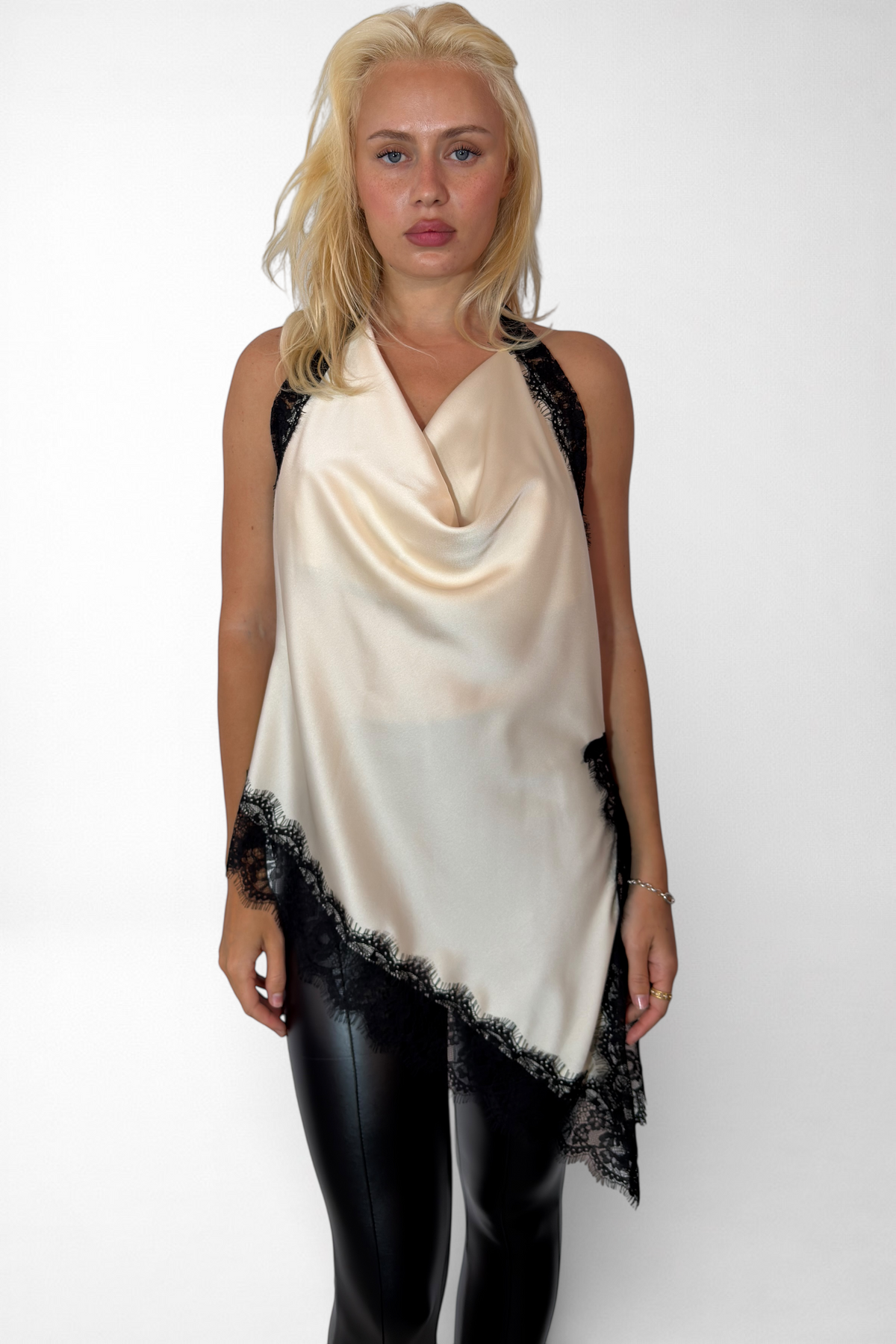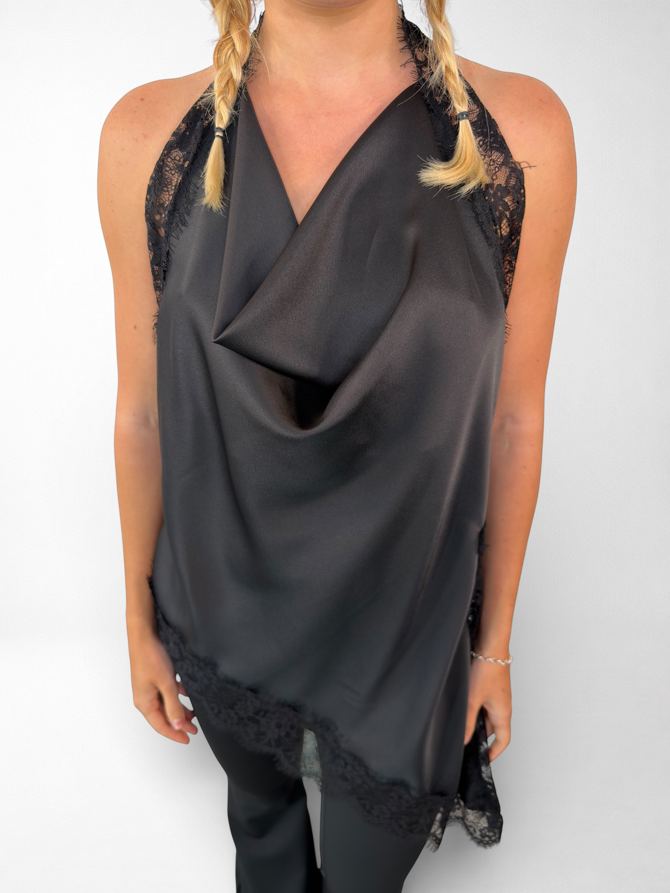 Top lencero satinado confeccionado en poliéster 100 × 100 con detalles en encaje que añaden sensualidad y sofisticación. Diseño aguinaldo que combina la suavidad del satén con la delicadeza del encaje, creando una prenda versátil para momentos especiales. Perfecta para quien busca confianza y elegancia en una sola pieza.