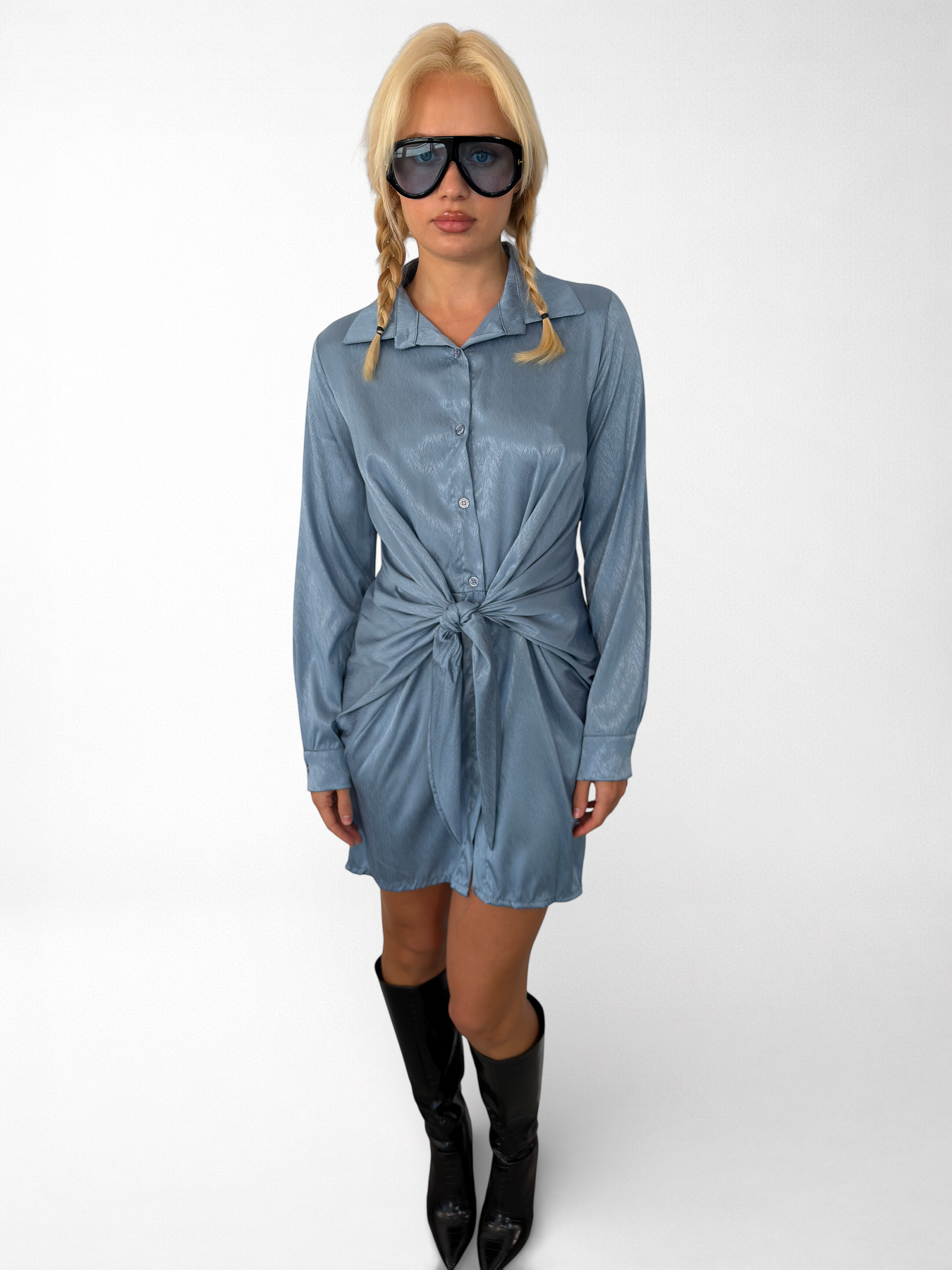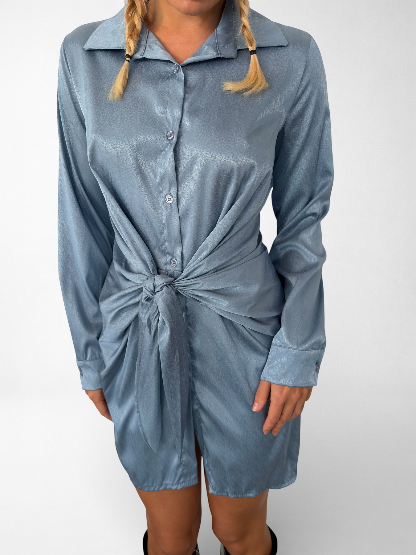 Descubre el Vestido Aria, confeccionado en suave tejido satinado que realza tu figura y ofrece comodidad. Su cierre de botones y lazo ajustable te permiten personalizar el fit, mientras que el elástico en la cintura asegura que te sientas bien durante todo el día. Perfecto para cualquier ocasión.