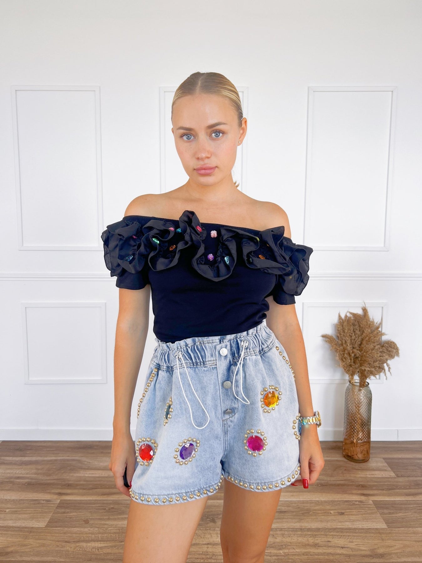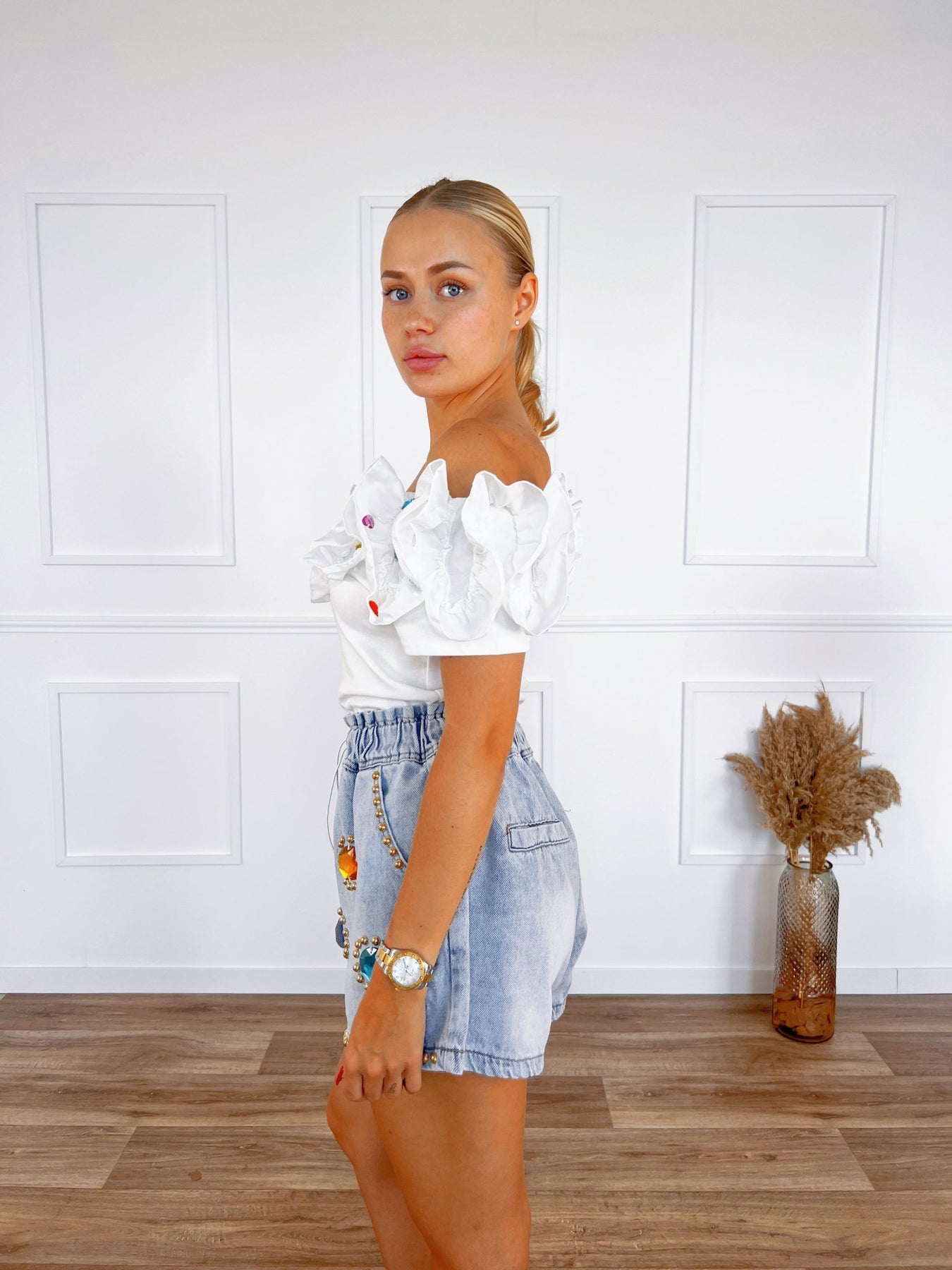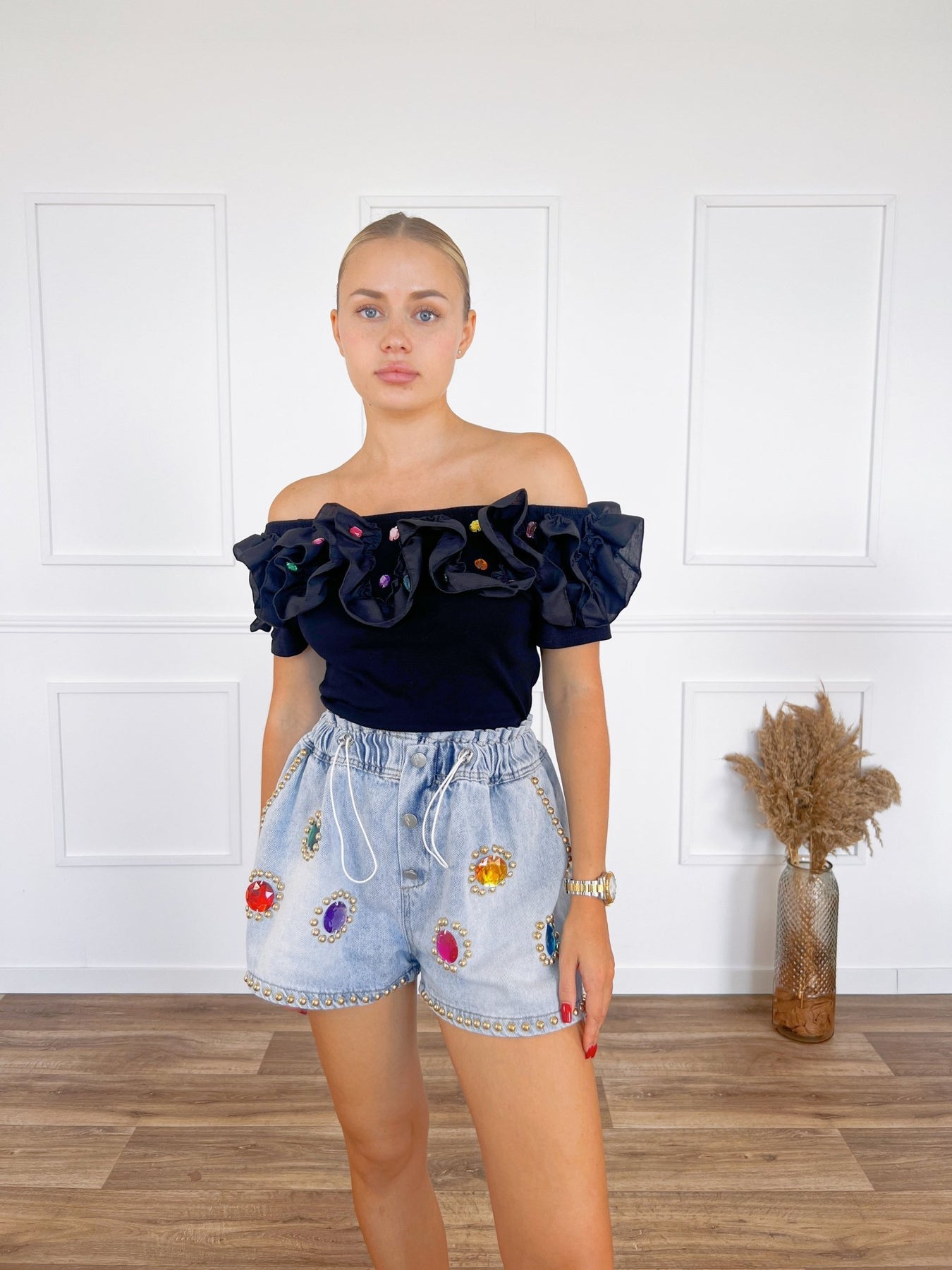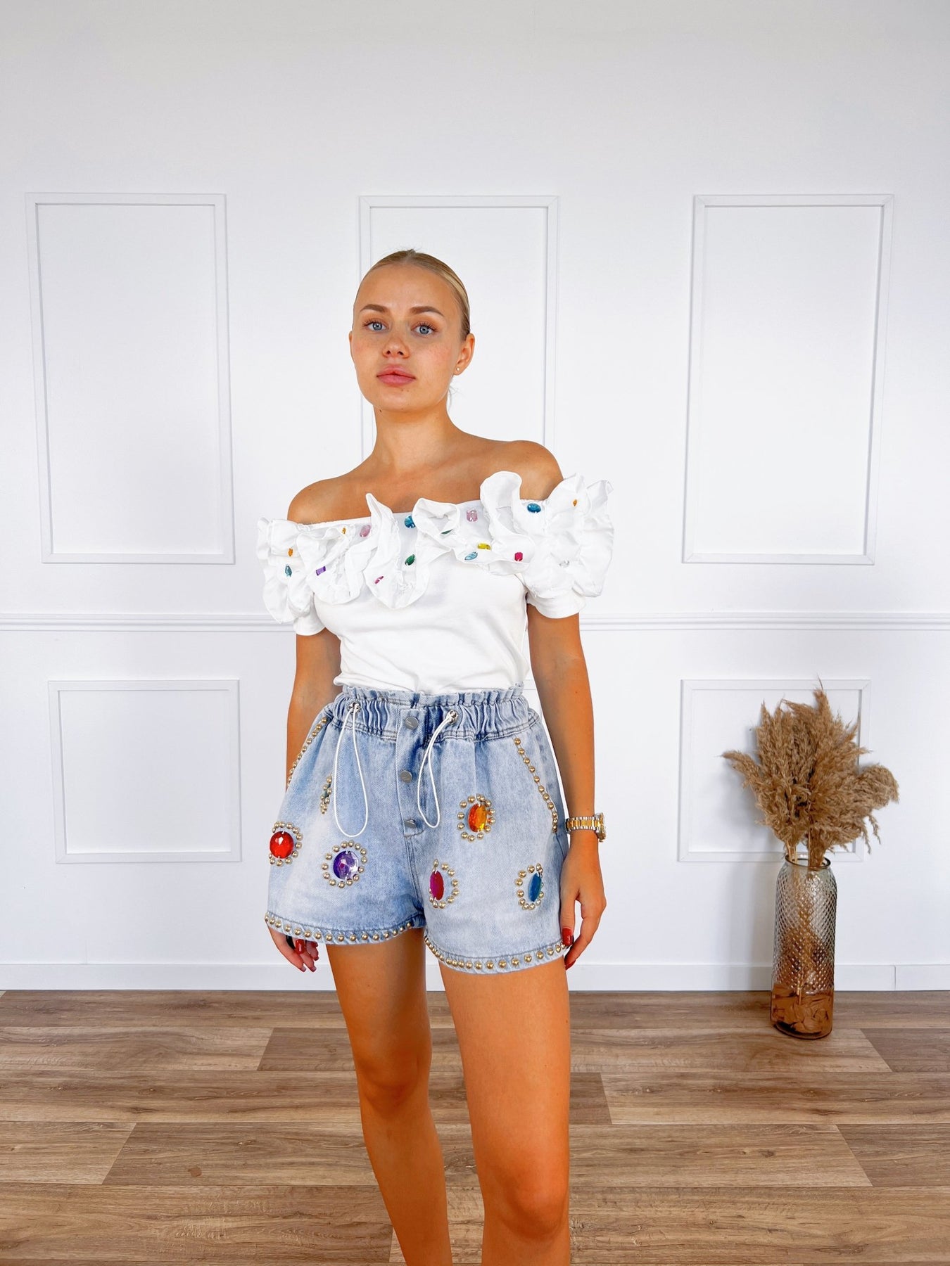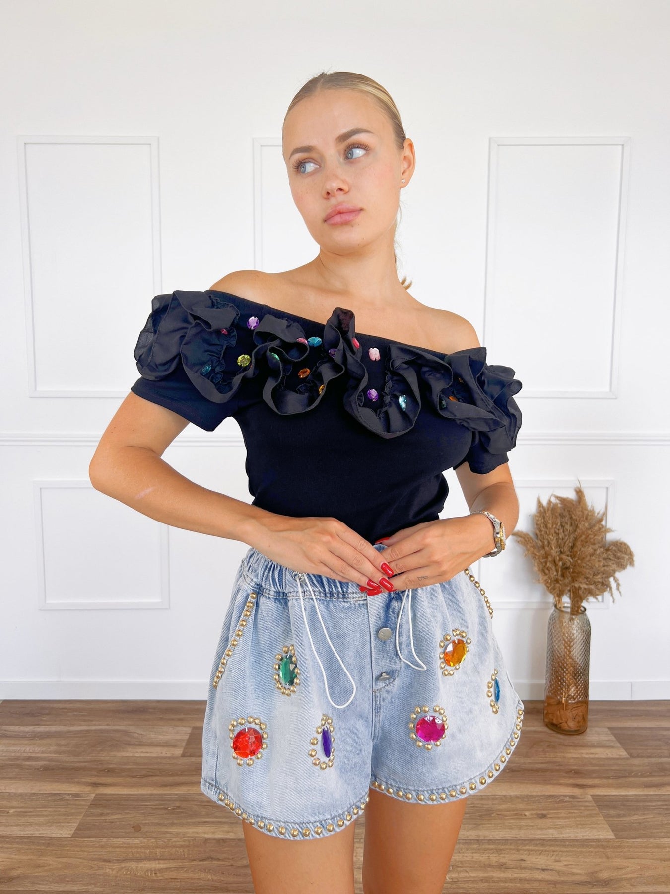 Esta Camiseta Preciosa te cubre con suavidad y comodidad. Está hecha con algodón elástico y con lindas piedras de colores que le agrega un toque glamoroso. Deslúmbrate y lucí la Camiseta Preciosa.